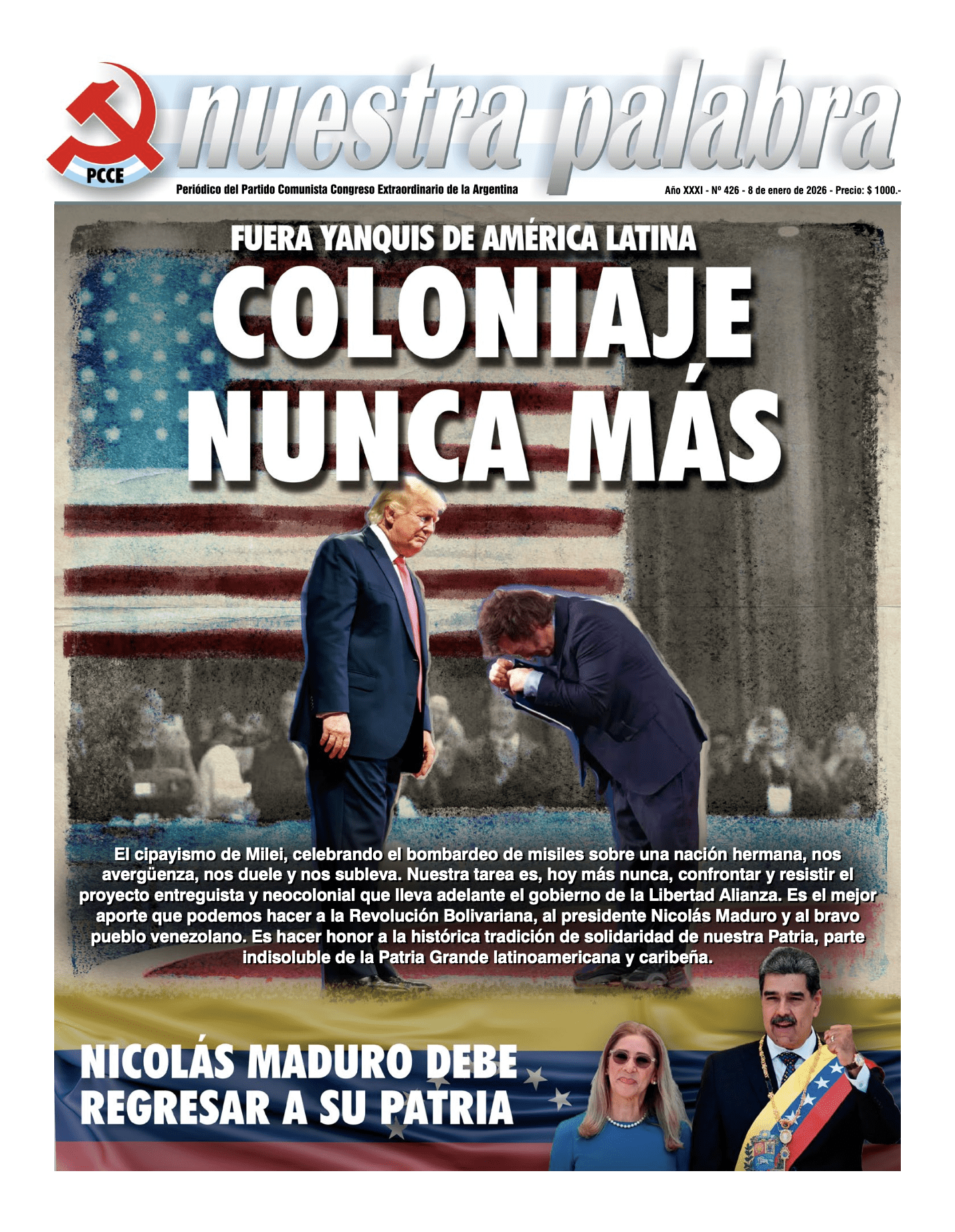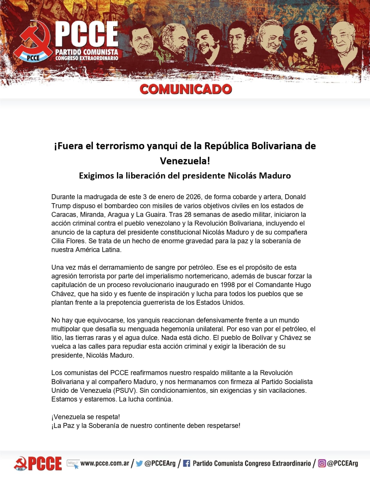 ¡Fuera el terrorismo yanqui de la República Bolivariana de Venezuela! Exigimos la liberación del presidente Nicolás Maduro