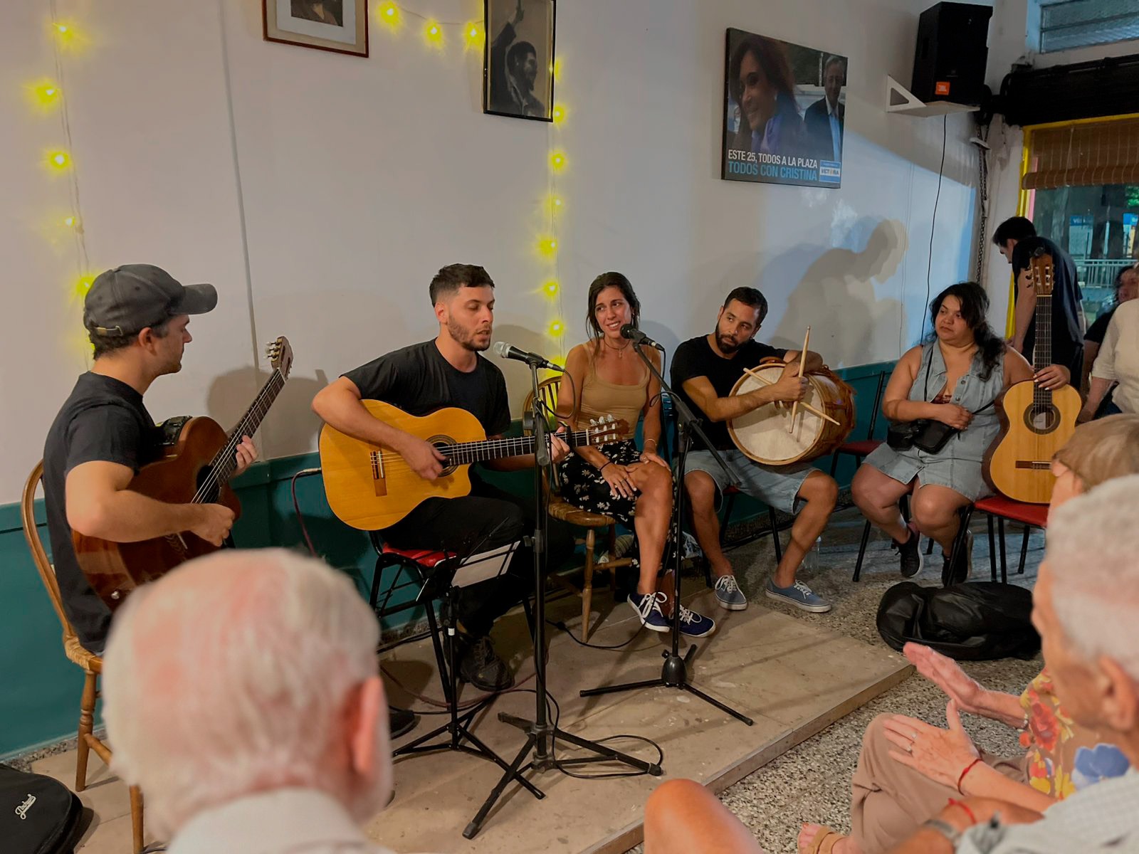 El nuevo Centro Cultural Mercedes Sosa vivió el último 7 de febrero su primera peña en una noche cargada de cultura popular y optimismo militante. Preparamos la actividad con muchas mesitas de volanteadas, hablando en comercios para que vecinos y laburantes conocieran el nuevo espacio en el barrio de Villa Adelina. Aprovechamos una linda noche en nuestro local frente a la estación para compartir folclore de la mano de Pedro, un amigo del CCMS con el que hicimos decenas de milongas y peñas. Lo acompañaron Manu, Ana y Pablo. Recorrieron lindas zambas y chacareras, y un momento muy bello fue cuando cantaron unos tangos con la potente voz de Gabi. Mientras la música llenaba el local, la vereda se completaba con mesas de vecinos y amigos, guirnaldas y charlas de militancia, donde el vecindario se arrimó a comer unas ricas pizzas y empanadas.